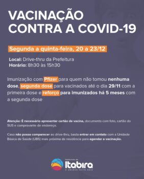 A imunização contra a Covid-19 continua em Itabira. Na próxima semana, de segunda-feira (20) a quinta-feira (23), das 8h30 às 15h30, a vacinação acontecerá no drive-thru da Prefeitura com o imunizante da Pfizer. Desta vez, a campanha é destinada para quem não tomou nenhuma dose da vacina; àqueles que foram imunizados com a primeira dose até o dia 29 de novembro (segunda dose); e para os imunizados há cinco meses com a segunda dose (reforço).