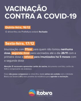 – Dia 17 (sexta-feira) – Imunização com a Pfizer para quem não tomou nenhuma dose, segunda dose para vacinados até o dia 26/11 com a primeira dose e reforço para imunizados há 5 meses com a segunda dose.