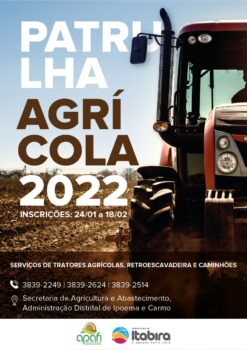As inscrições para o projeto de Mecanização e Transportes Rurais da Patrulha Agrícola estão abertas. Os produtores rurais de Itabira podem se inscrever para solicitar os serviços até o dia 18 de fevereiro, data aberta para o primeiro semestre de 2022. Para participar,é necessário comparecer na Secretaria de Agricultura e Abastecimento, na Avenida das Rosas, número 134, Centro, ou nas administrações distritais de Senhora do Carmo e Ipoema.