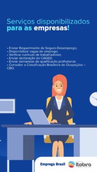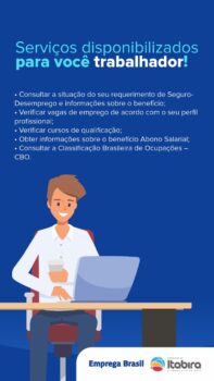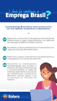 O Sistema Nacional de Emprego de Itabira (Sine) é um órgão federal e no munícipio conta com o apoio da Secretaria Municipal de Desenvolvimento Econômico, Ciência, Tecnologia, Inovação e Turismo (SMDECTIT). Para melhorar o atendimento virtual aos trabalhadores em busca de uma recolocação no mercado de trabalho e outros atendimentos disponibilizados, o órgão está lançando uma campanha para popularizar o portal “Emprega Brasil”, que pode ser acessado no seguinte link: https://empregabrasil.mte.gov.br/