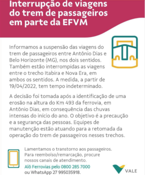 A Vale informou nesta terça-feira (19/04), a suspensão das viagens do trem de passageiros entre Antônio Dias e Belo Horizonte (MG), nos dois sentidos.Também estão interrompidas as viagens entre o trecho Itabira e Nova Era, em ambos os sentidos. A medida, a partir de 19/04/2022, tem tempo indeterminado.