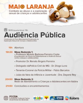 Neste mês, no qual é difundida a campanha Maio Laranja – Combate ao Abuso e à Exploração Sexual de Crianças e Adolescentes, o Município promove ações de enfrentamento à violência. Em uma audiência pública, marcada para a quarta-feira (18), a Prefeitura de Itabira fomentará a construção do Plano Municipal de Erradicação da Exploração Sexual de Crianças e Adolescentes. O encontro, aberto a toda a comunidade, acontecerá a partir das 19h, na Fundação Cultural Carlos Drummond de Andrade (FCCDA).