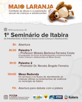 Já na quinta-feira (19), Itabira celebra o 1º Seminário de Enfrentamento à Violência Sexual Contra Crianças e Adolescentes. Participam do encontro vários setores da sociedade, com o objetivo de promover e consolidar as políticas públicas de enfrentamento à violência. O evento começa às 8h, na FCCDA.