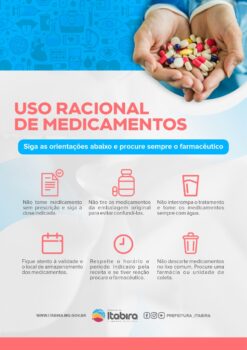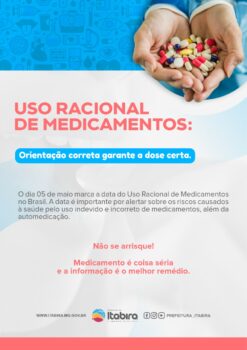 Em Itabira a campanha ganhou o slogan “Orientação correta, garante a dose certa”. Além do movimento no dia 5, a Secretaria vai realizar palestras com a participação do grupo do Núcleo Ampliado de Saúde da Família (NASF), com o tema “Uso Racional de Medicamento”. No PSF do bairro Praia 2/Juca Rosa, na terça-feira (3/05), a palestra será com a farmacêutica Laryssa Ferreira de Assis. Ainda no dia 3, acontece no Centro de Convivênica uma palestra com a farmacêutica Síntia Alves Silva Soares. Na Associação dos Moradores do Eldorado, na quarta-feira (4), a palestra fica por conta de Vera Lúcia Frederico. As ações visam alertar a comunidade sobre os riscos causados à saúde pelo uso indevido e incorreto de medicamentos e automedicação.