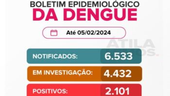 Segundo os dados, Itabira registra 6.533 notificações; sendo 2.101 casos positivos para dengue, em investigação 4.432 casos e 03 óbitos . Ainda segundo o Boletim 57 pessoas estão internados em Itabira.