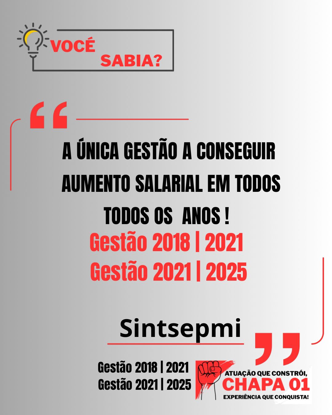 Com o slogan “Atuação que constrói, experiência que conquista”, a Chapa 01 sustenta que seguirá empenhada em defender melhorias reais, mantendo o compromisso de valorização salarial anoGestão do Sintsepmi é a única a garantir aumento salarial anual em duas gestões consecutivas após ano.