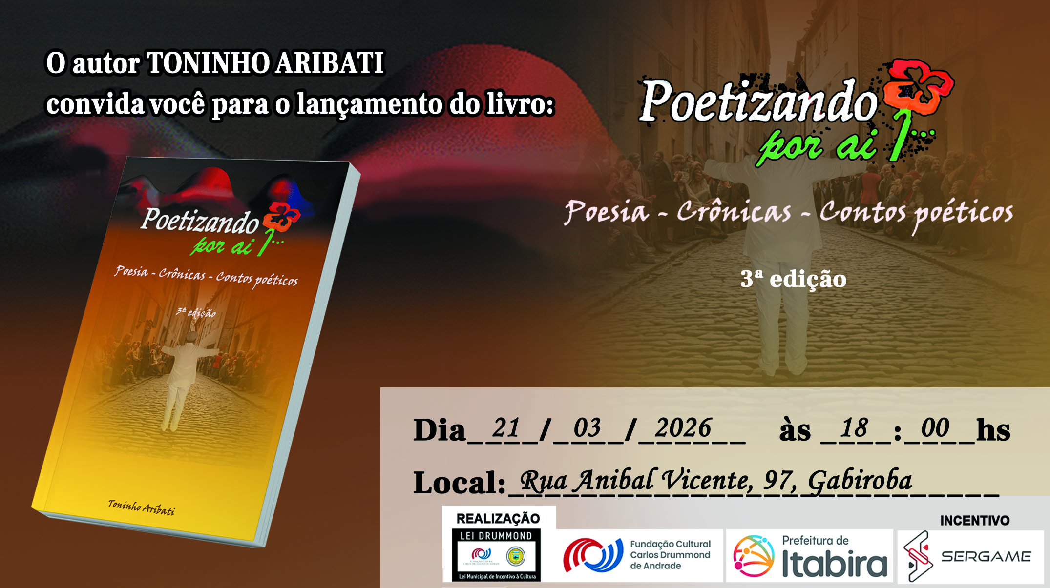 Itabira recebe, no dia 21 de março, uma celebração especial dedicada à poesia e à literatura. Será lançado, às 18h, o livro Poetizando por Aí…, obra que reúne textos poéticos voltados à sensibilidade, à reflexão e à valorização da produção cultural local. A data escolhida coincide com o Dia Mundial da Poesia, reforçando o caráter simbólico e cultural do evento.