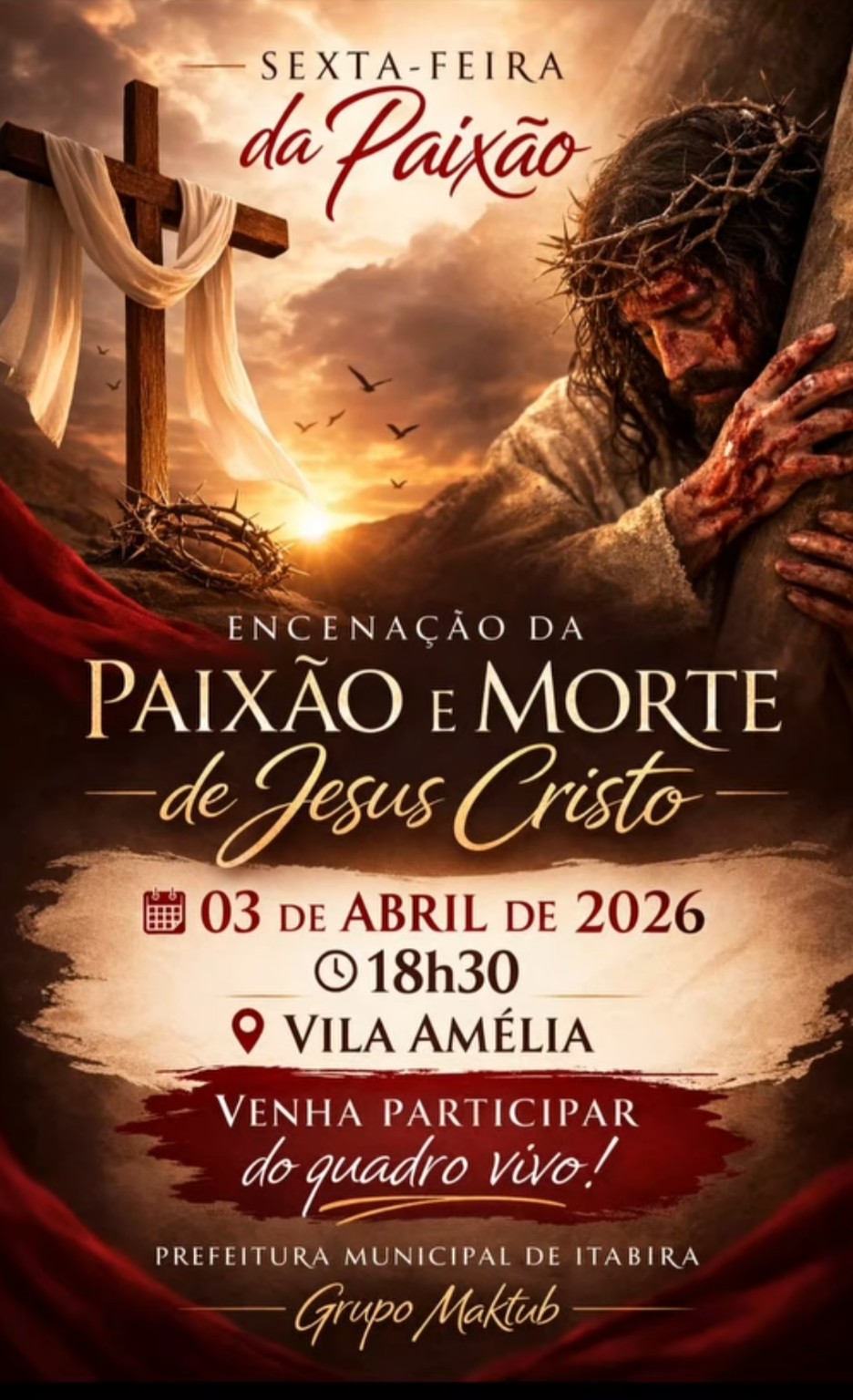 Promovida com o apoio da Prefeitura Municipal de Itabira e organizada pelo Grupo Maktub, a apresentação promete reviver os últimos momentos de Jesus Cristo de forma intensa e emocionante, por meio de um espetáculo ao ar livre que combina interpretação teatral, cenografia e simbolismo religioso.